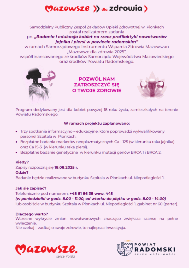 Samodzielny Publiczny Zespół Zakładów Opieki Zdrowotnej w Pionkach realizuje program pn. „Badania i edukacja kobiet na rzecz profilaktyki nowotworów jajnika i piersi w powiecie radomskim”, w ramach projektu „Mazowsze dla zdrowia 2025”. Działania są współfinansowane ze środków Samorządu Województwa Mazowieckiego oraz Powiatu Radomskiego.