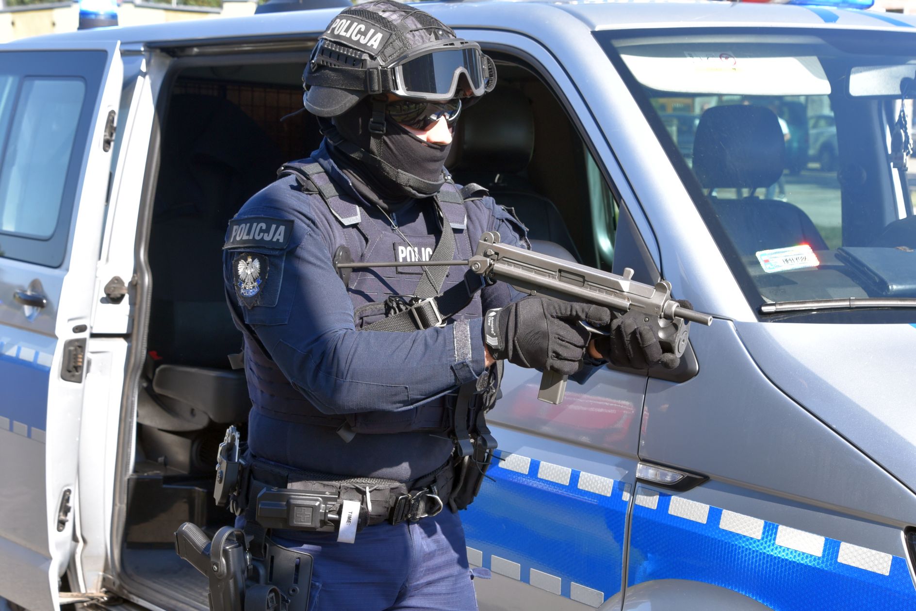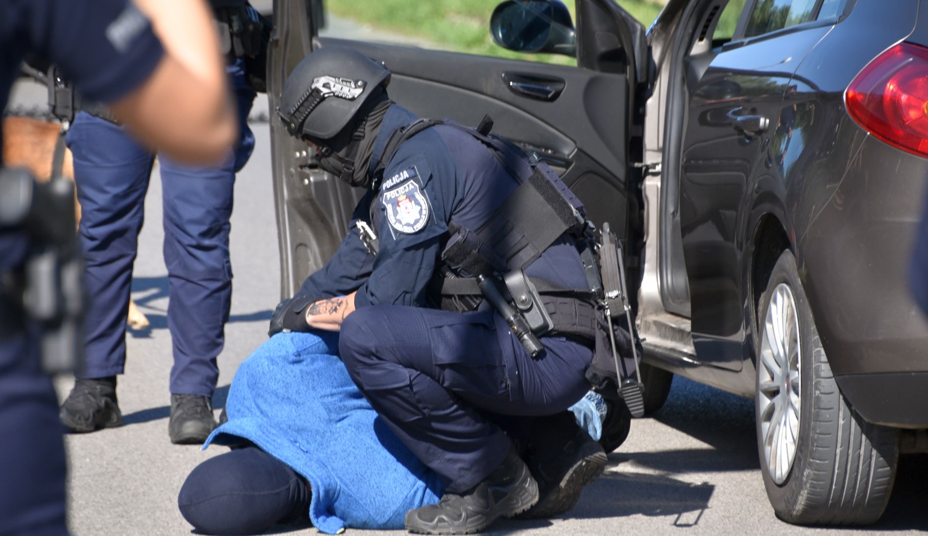Z uwagi na docierające do patroli informacje o posiadaniu przez kierującego i pasażera przedmiotów przypominających broń palną, zostały wystawione kolejne posterunki, w tym również w miejscowości Domaniów. Funkcjonariusze Nieetatowej Grupy Realizacyjnej zajechali mu drogę przy wykorzystaniu radiowozu, rozłożyli tez kolczatkę Auto Stop. Sprawca napadu na urząd i jego pomocnik, widząc, że nie mają szans na ucieczkę, zatrzymali się. Wówczas policjanci, przy wykorzystaniu odpowiedniej taktyki i granatów hukowych, dokonali dynamicznego zatrzymania i obezwładnienia dwóch mężczyzn, znajdując przy nich broń palną.