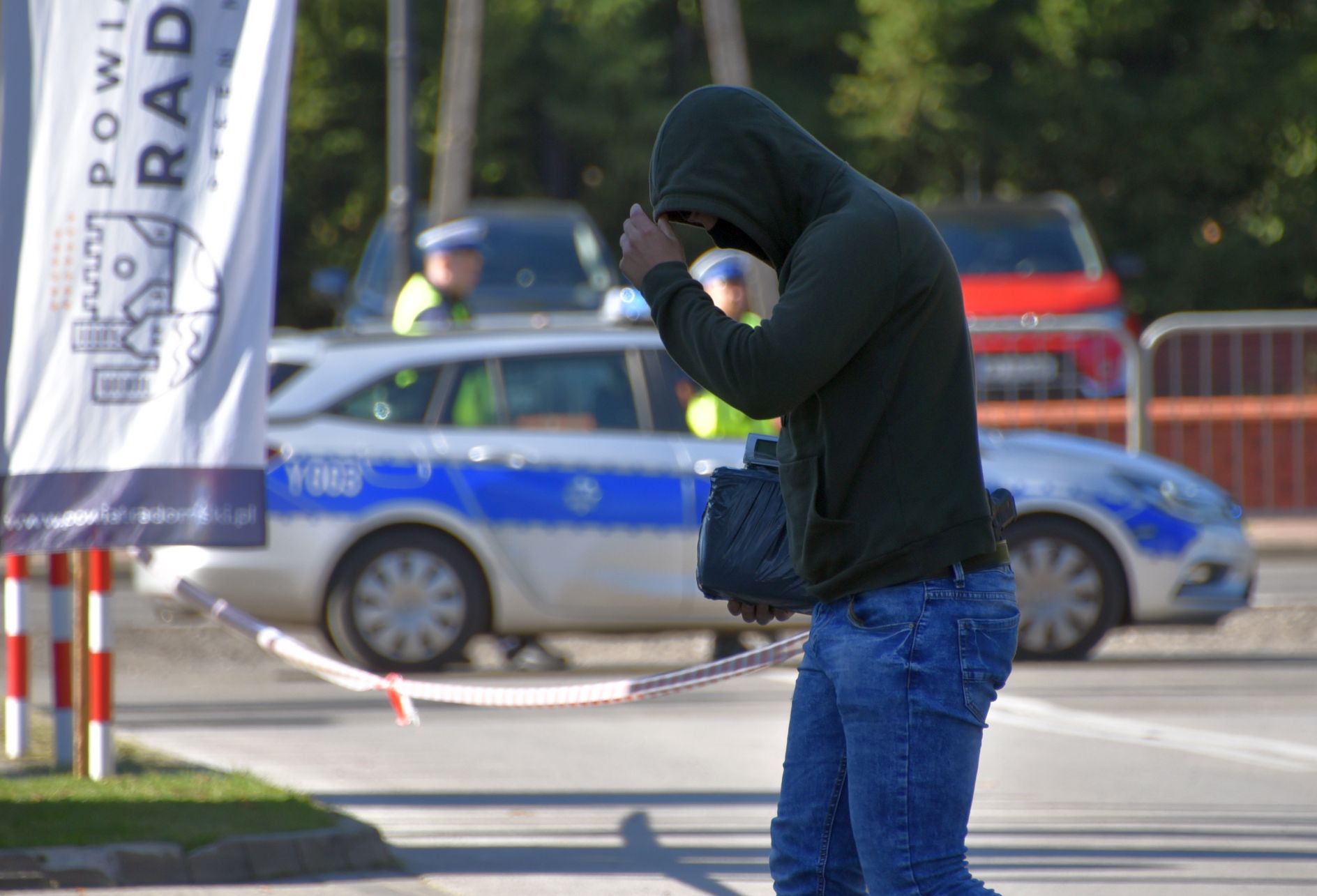 Jak się okazało, uzbrojony sprawca uciekł do czekającego przed urzędem samochodu, a następnie rozpoczął ucieczkę w kierunku gminy Przytyk. Rozpoczął się pościg, prowadzony przez Nieetatową Grupę Realizacyjną KMP w Radomiu. Tymczasem patrol radomskiej drogówki, pełniący służbę przy drodze wojewódzkiej numer 740 w miejscowości Wrzeszczów zauważył, jak kierujący pojazdem osobowym na widok radiowozu zawrócił i zjechał w drogę leśną. Patrol ruszył więc w pościg za tym samochodem z użyciem sygnałów dźwiękowych i świetlnych, powiadamiając jednocześnie oficera dyżurnego KMP Radom.