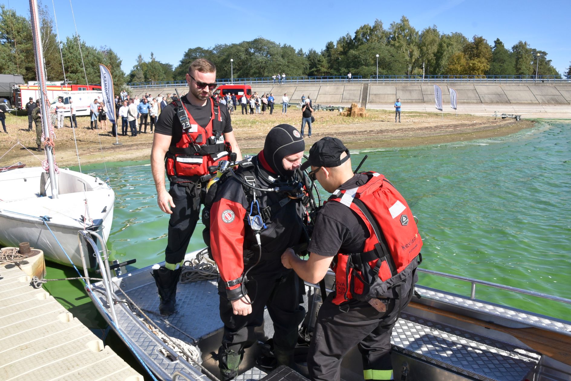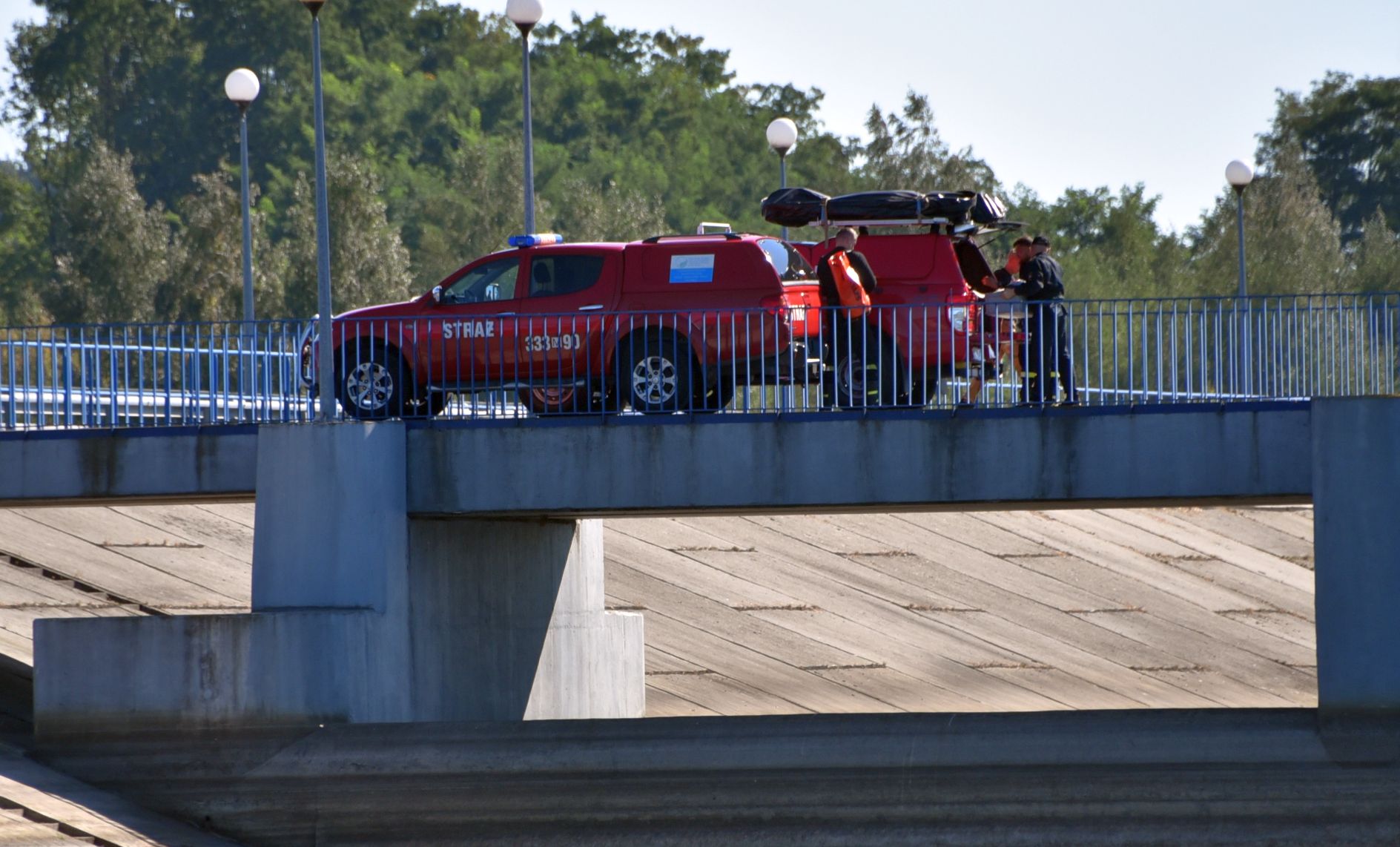 Tymczasem nurkowie zauważyli, że z beczki, przewożonej w busie wydobywa się nieznana substancja, barwiąc wodę na zielono. Ne miejsce wyruszyła kolejna Specjalistyczna Grupa Ratownictwa Chemiczno – Ekologicznego RADOM 6. Ich ciężki wóz ratowniczy nie miał możliwości dojazdu bezpośrednio do brzegu, dlatego strażacy przetransportowali na miejsce potrzebne wyposażenie za pomocą modułowego wózka. Przygotowali specjalny wąż, do którego wtłaczali powietrze, układając go na powierzchni wody tak, aby ograniczyć rozprzestrzenianie się substancji. Następnie, po wyłowieniu i zabezpieczeniu beczki, przekazali ją do dalszego badania.