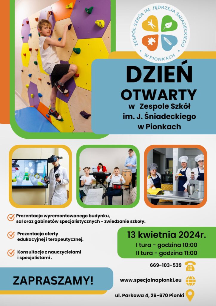 W sobotę, 13 kwietnia rodziców uczniów oraz zainteresowanych mieszkańców Pionek i okolic zaprasza z kolei Zespół Szkół im. J. Śniadeckiego. To znana i wysoko oceniana szkoła specjalna, która od niedawna mieści się w nowoczesnym, wyremontowanym i dostosowanym dla osób niepełnosprawnych budynku. W programie m.in. prezentacja sal oraz gabinetów specjalistycznych, oferty edukacyjnej i terapeutycznej oraz konsultacje z nauczycielami i specjalistami. Zwiedzanie szkoły odbywać się będzie w dwóch turach, o godz. 10.00 oraz 11.00.