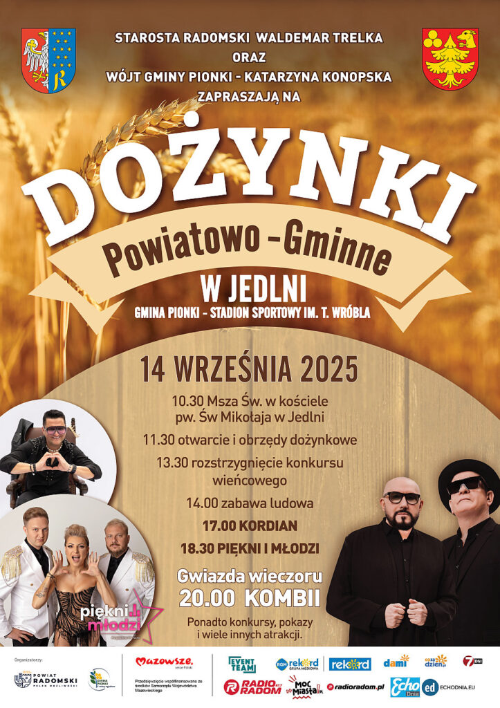 Tegoroczne Dożynki Powiatowo–Gminne odbędą się w niedzielę, 14 września w Jedlni w gminie Pionki. Będzie barwny korowód, tradycyjne obrzędy dożynkowe oraz występy kapel i zespołów ludowych. Muzycznymi gwiazdami wydarzenia będą Kordian, Piękni i Młodzi z Magdą Narożną oraz KOMBII. Gospodarzami wydarzenia są starosta radomski Waldemar Trelka oraz wójt gminy Pionki Katarzyna Konopska.