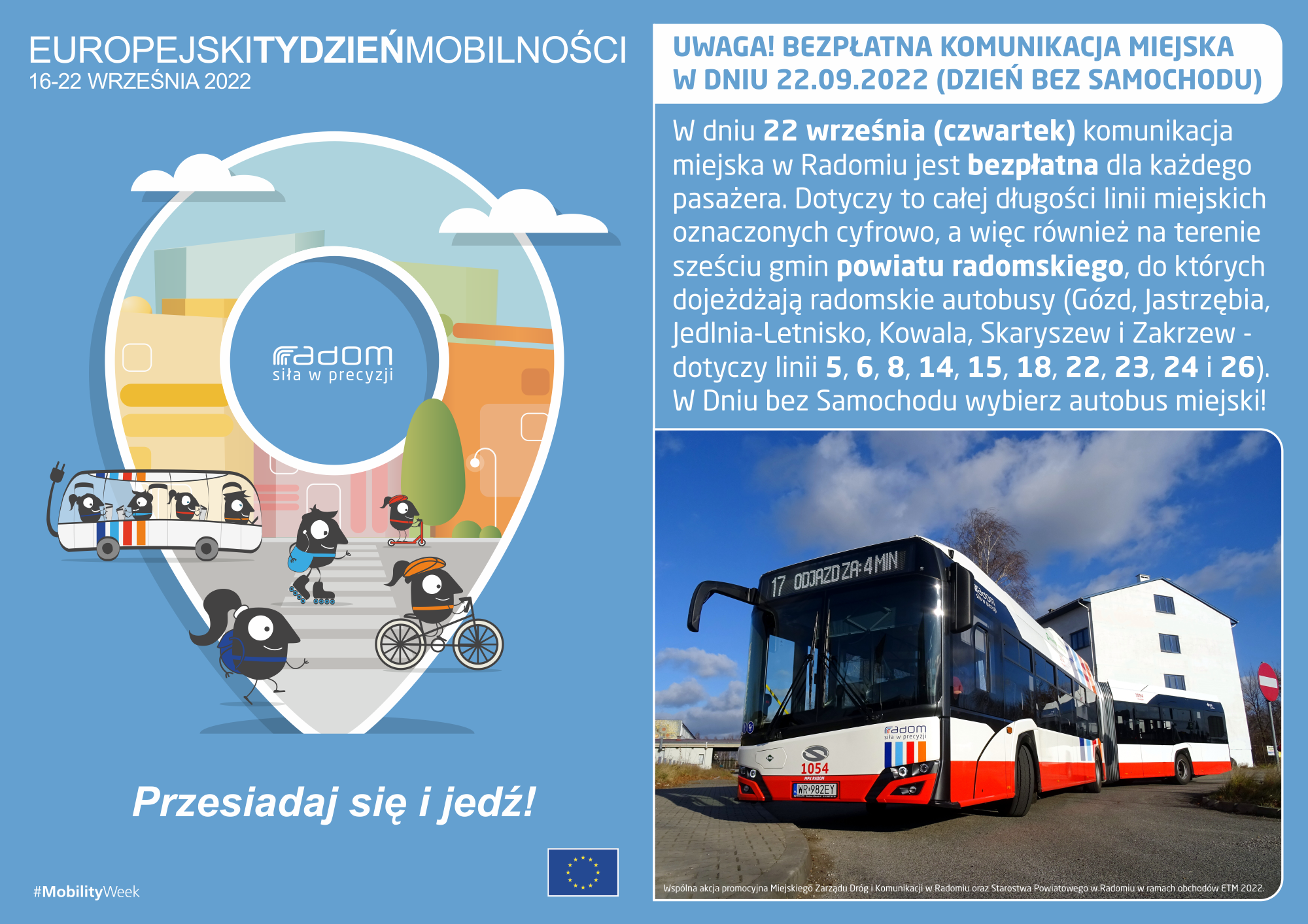 W czwartek, 22 września przejazdy autobusami komunikacji miejskiej w Radomiu będą BEZPŁATNE dla wszystkich pasażerów – również mieszkańców tych gmin Powiatu Radomskiego, do których docierają linie komunikacji miejskiej oznaczone cyfrowo (5, 6, 8, 14, 15, 18, 22, 23, 24 i 26), czyli Miasto i Gmina Skaryszew, Gmina Zakrzew, Gmina Kowala, Gmina Jastrzębia, Gmina Gózd, Gmina Wolanów czy Urząd Miejski w Jedlni-Letnisku.