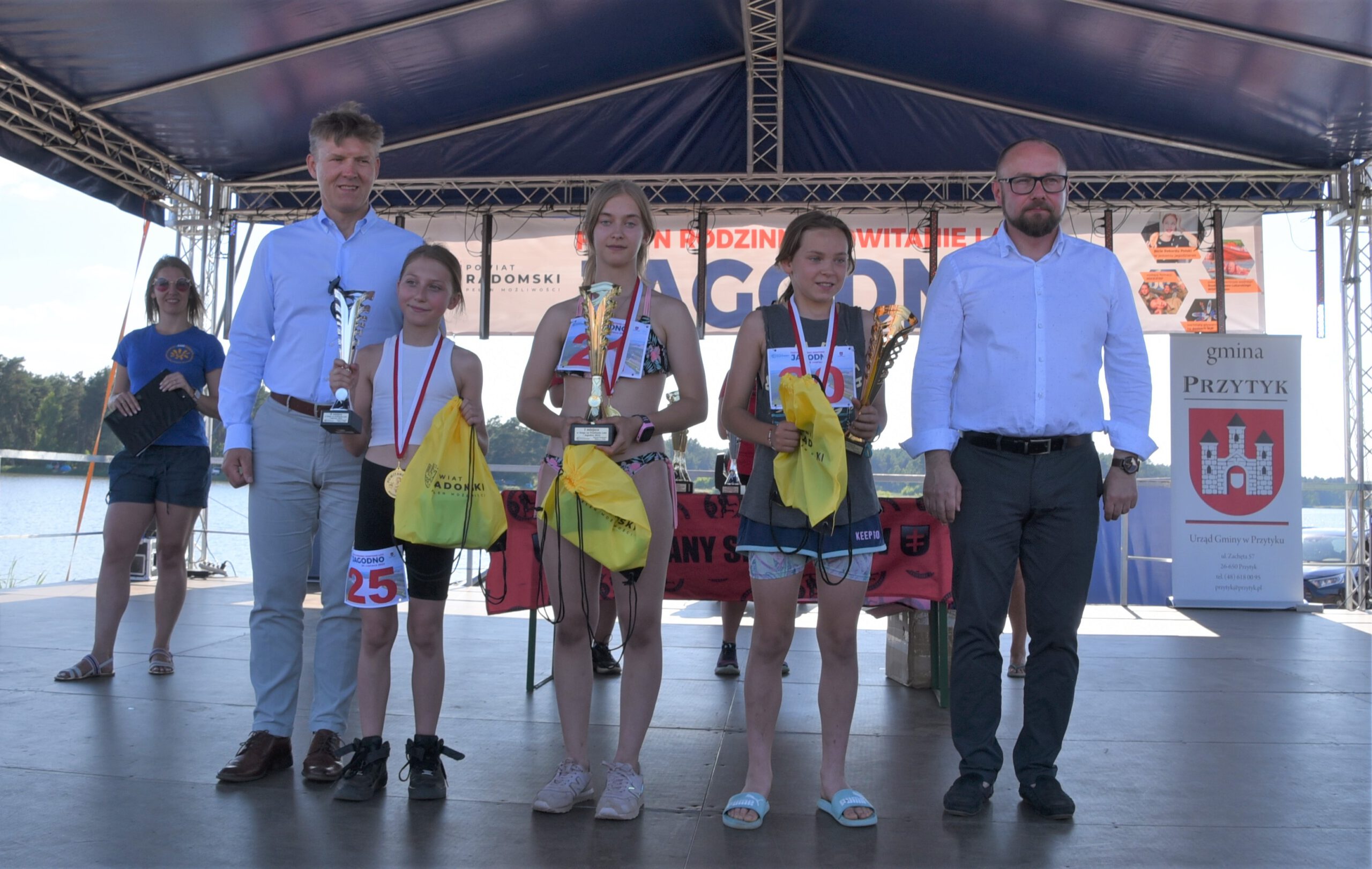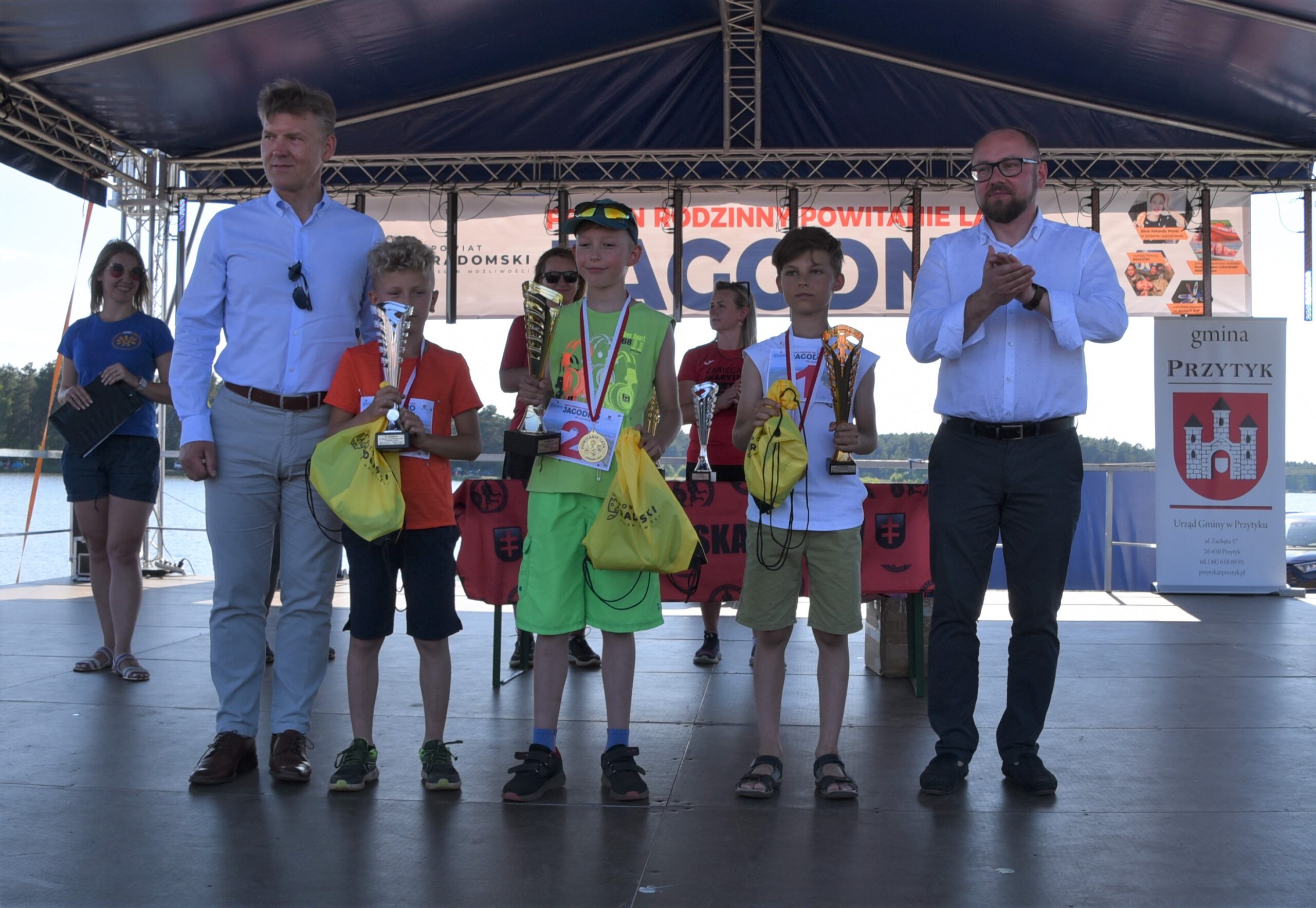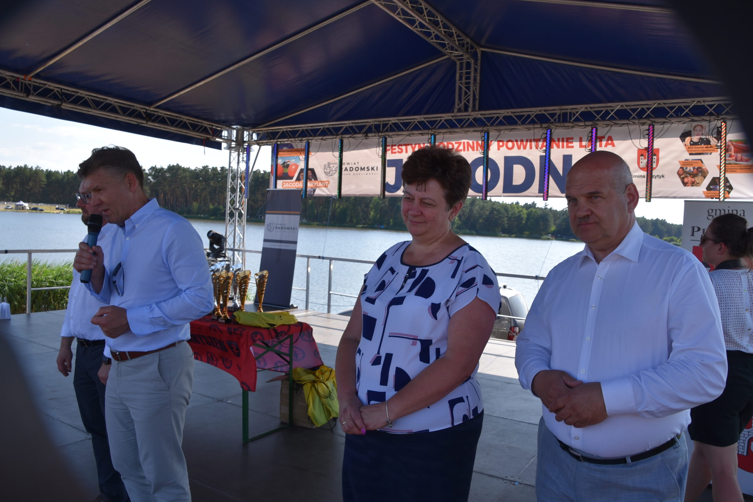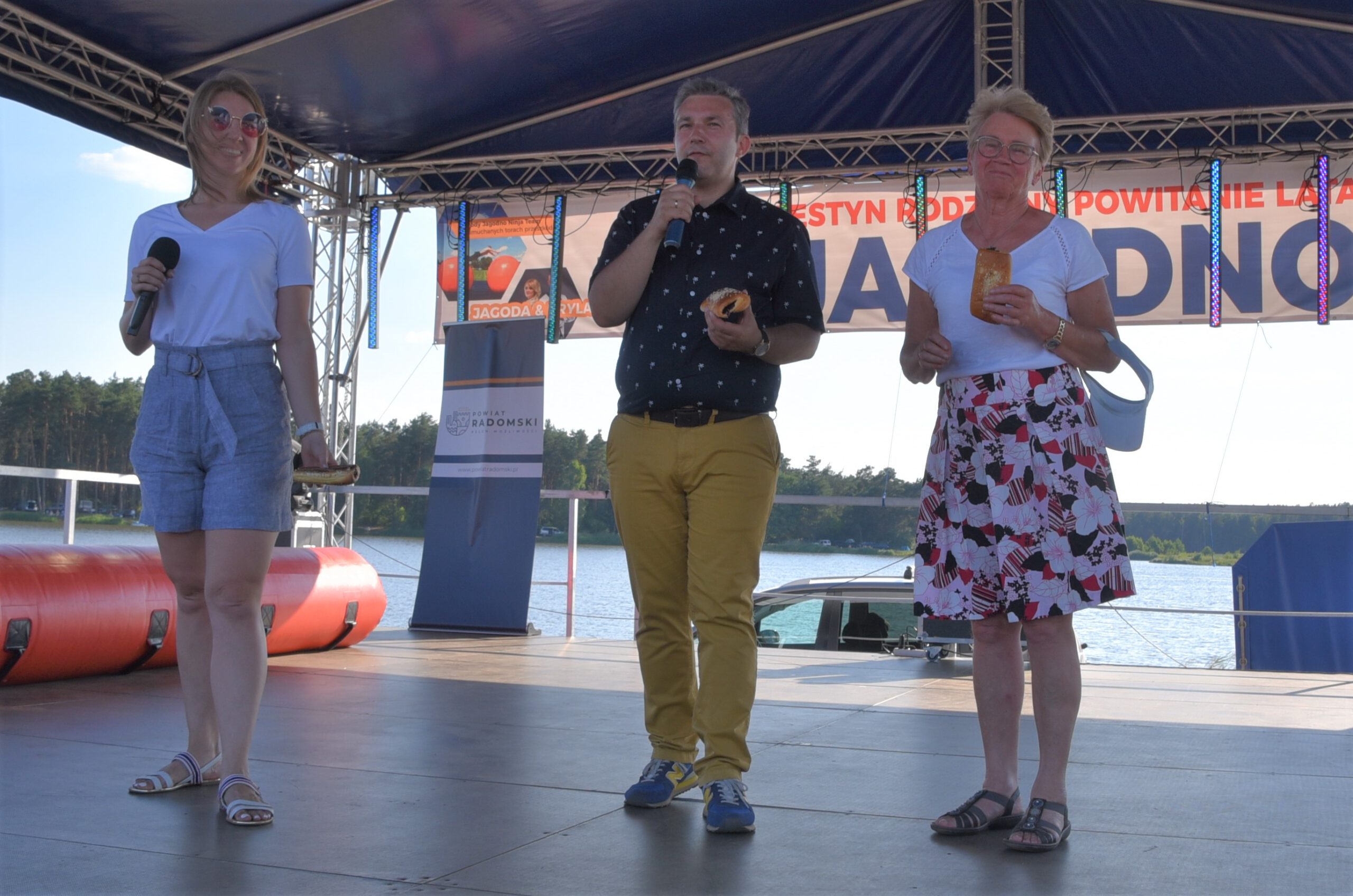 W niedzielę, 26 czerwca nad zalewem Jagodno w gminie Przytyk zaprosiliśmy mieszkańców powiatu na Festyn Rodzinny pod hasłem „Powitanie Lata”. Odbyła się pierwsza edycja zawodów na pneumatycznych torach przeszkód Ninja Jagodno Team, a także przeciąganie liny i wyścigi na ruroskoczkach. Pobiliśmy również wakacyjny rekord Polski w jednoczesnym jedzeniu jagodzianek. Na scenie wystąpiły m.in. formacje radomskiej szkoły tańca Rockstep, a także roztańczone dziewczęta z Centrum Kultury i Biblioteki w Przytyku. Były biegi dzieci, pokazy ratownictwa wodnego i warsztaty pływania na deskach SUP. Na koniec wystąpił Zespół Jagoda & Brylant.