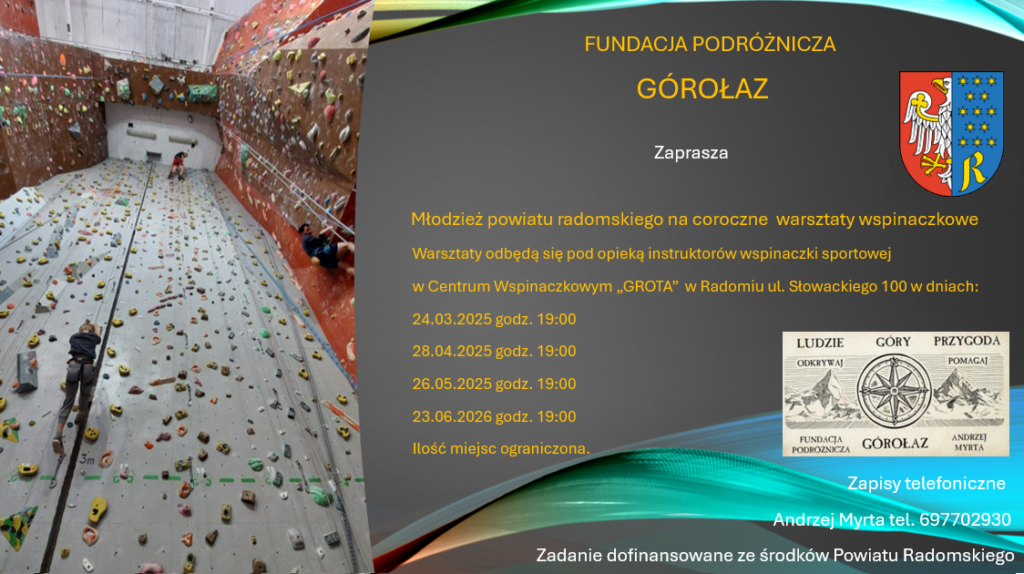 Już po raz kolejny Andrzej Myrta podróżnik, alpinista, znany wspinacz organizuje bezpłatne zajęcia wspinaczkowe dla młodzieży z Powiatu Radomskiego. Zapisy trwają!
