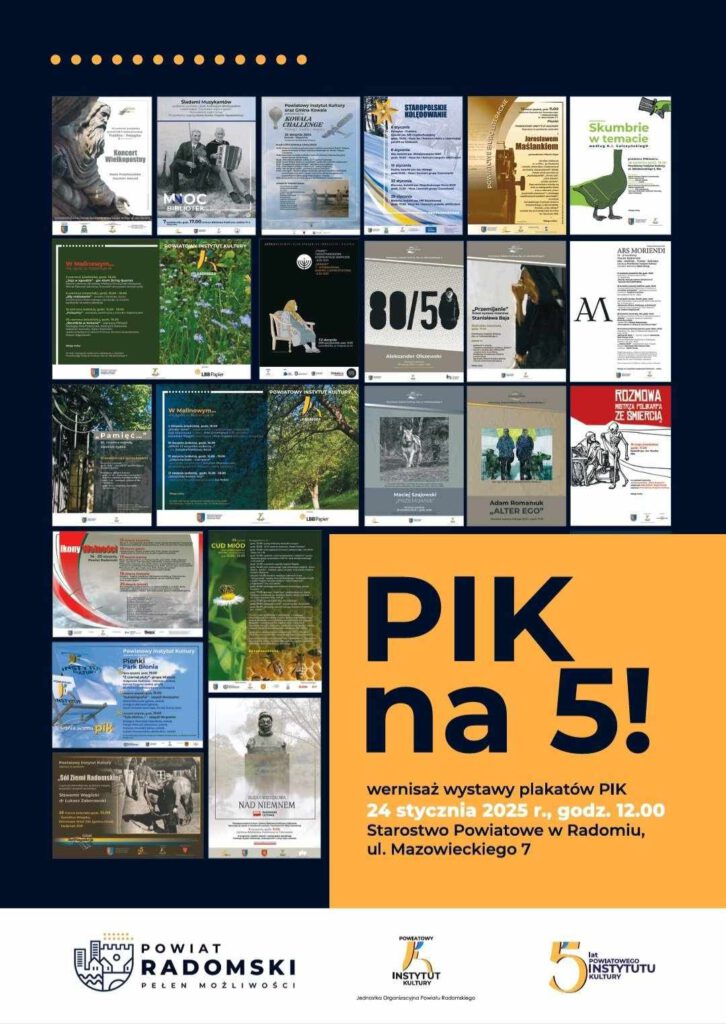 „PIK na 5!” to opowieść o dotychczasowych – bardzo różnorodnych i rozrzuconych po terenie całego Powiat Radomski – działaniach naszej placówki przez reklamujące je plakaty. Oczywiście, pokazujemy jedynie wybrane grafiki, stanowiące tylko część naszej bogatej oferty.