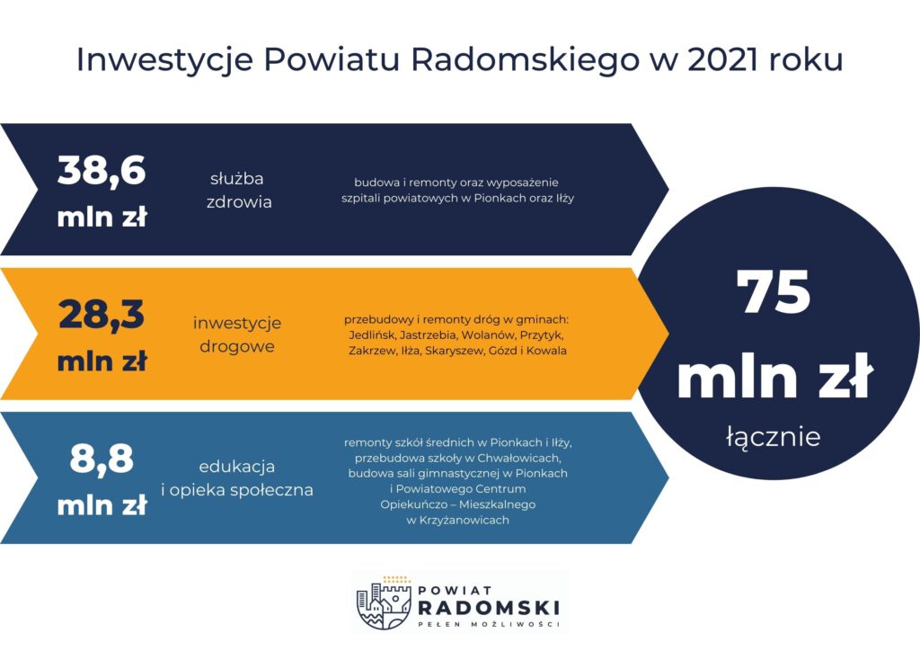 Miniony już rok 2021 to czas wielu zmian na plus w Powiecie Radomskim. Najważniejsze obszary inwestycyjne to: drogi, służba zdrowie, edukacja i opieka społeczna. W sumie na inwestycje z budżetu powiatu wydano ponad 75 milionów złotych, z czego znaczna część pochodziła z rozmaitych dofinansowań, przede wszystkim programów rządowych.