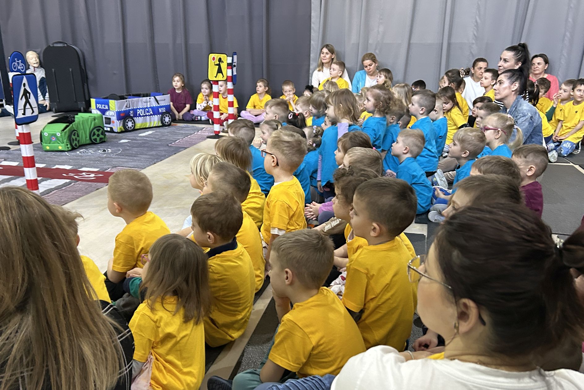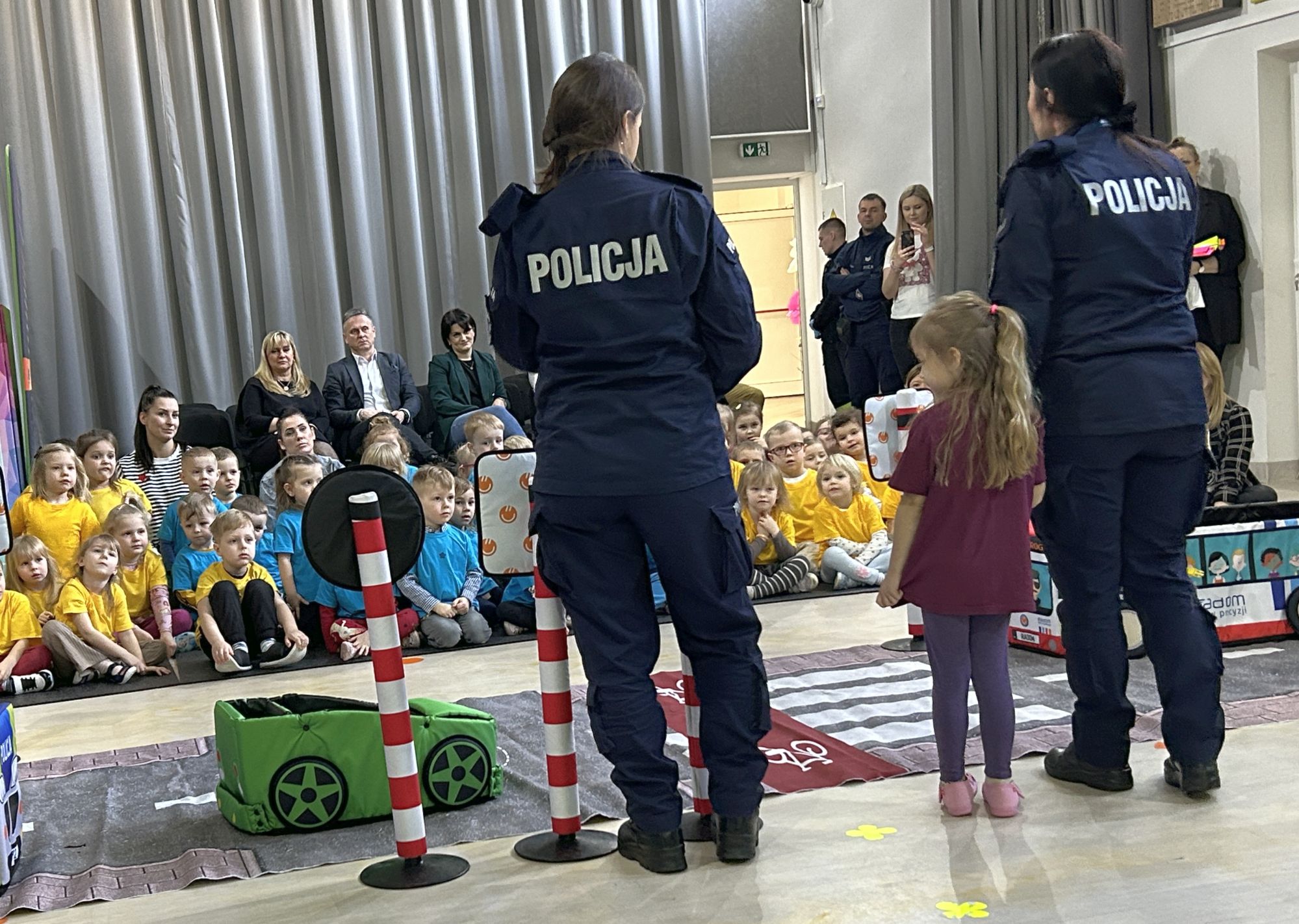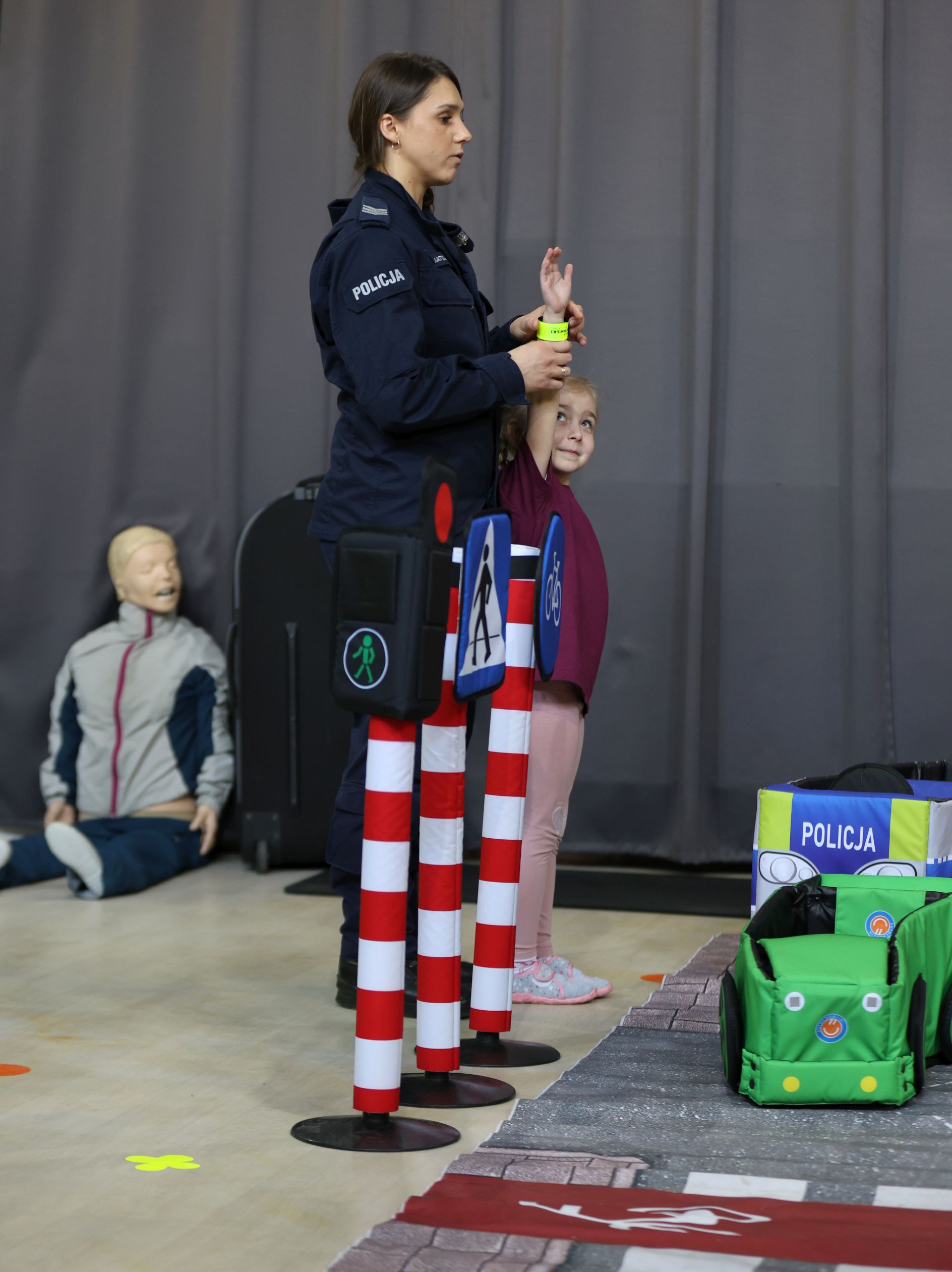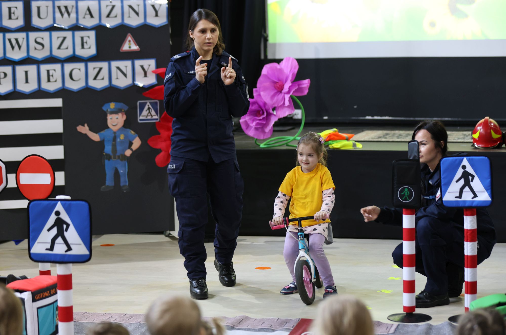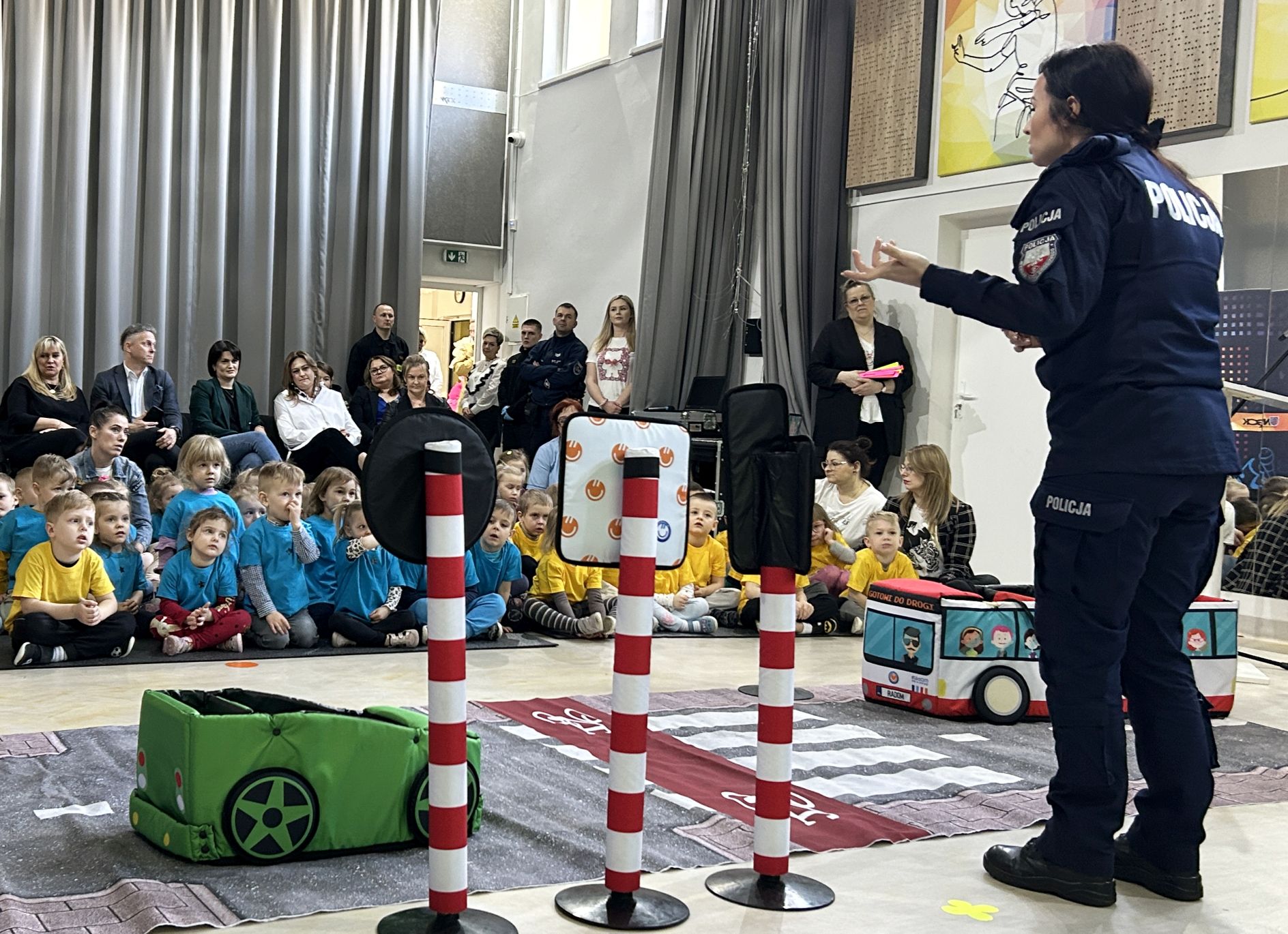 Panie policjantki z Wydziału Ruchu Drogowego na specjalnie zorganizowanym placu przedstawiły przedszkolakom krótką symulację jak bezpiecznie przechodzić przez jezdnie, jak korzystać ze ścieżki rowerowej, jak czytać informację z sygnalizacji świetlnych.