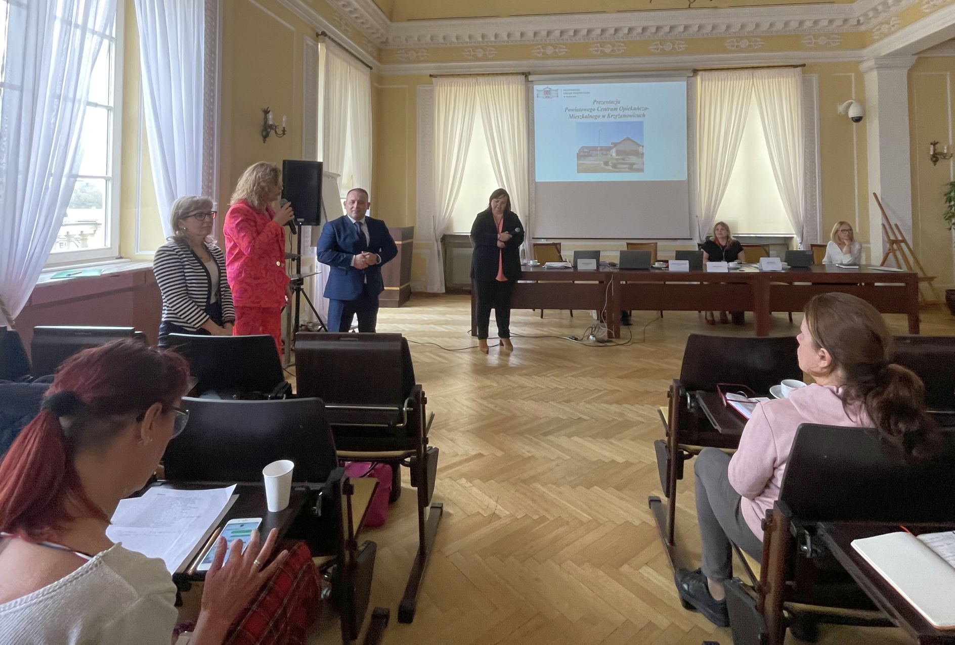 Na prośbę urzędu poproszono przedstawicieli PCOM w Krzyżanowicach o zaprezentowanie jednostki. Prezentacja miała charakter krótkiego filmu, który przedstawiał powstanie placówki od etapu wniosku, aż po oddanie obiektu oraz bieżące funkcjonowanie. Wspomniana prezentacja poprzedzona była wokalnym występem Tomasza, jednego z podopiecznych PCOM Krzyżanowice. Głos zabrała również Dyrektor Powiatowego Centrum Pomocy Rodzinie w Radomiu – Jolanta Borek, Kierownik Zespołu ds. Organizacyjnych i Placówek Pomocy Społecznej w PCPR w Radomiu – Małgorzata Mroziewicz-Górnik oraz kierownik PCOM – Sylwester Gałek.