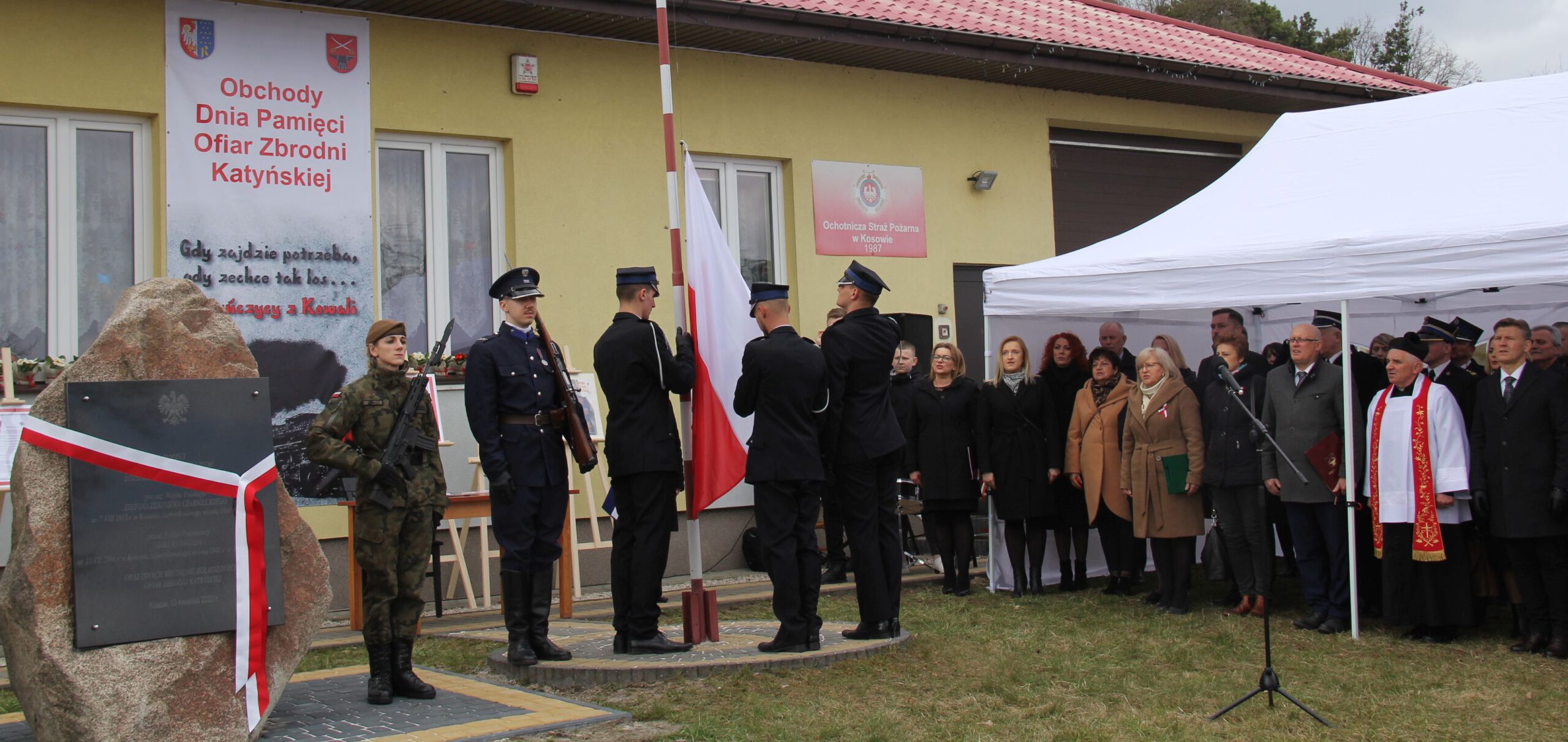 Po Mszy świętej w kościele parafialnym w Kowali – Stępocinie, uczestnicy uroczystości spotkali się przed miejscem pamięci w Kosowie. Pod kamieniem – pomnikiem stanęły warty honorowe, wystawione przez Wojska Obrony Terytorialnej oraz członków Grupy Rekonstrukcji Historycznej GRH III Okręgu Policji Państwowej Komisariat w Radomiu. Wokół stanęły również pododdziały Ochotniczych Straży Pożarnych z Kowali – Stępociny, Bardzic, Kosowa i Rudy Małej wraz z pocztem sztandarowym, a druhowie przy dźwiękach hymnu uroczyście wciągnęli na maszt flagę państwową.