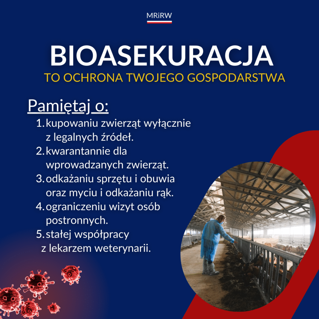 6. Ograniczenie kontaktu: Należy unikać kontaktu ze zwierzętami z innych gospodarstw, nie użyczać sprzętu rolniczego ani wykorzystywanego w gospodarstwach, zwłaszcza w przypadku podejrzenia zakażenia i w okresie wzmożonego zagrożenia. Należy również bezwzględnie przestrzegać zakazu wchodzenia na teren gospodarstwa osób postronnych.