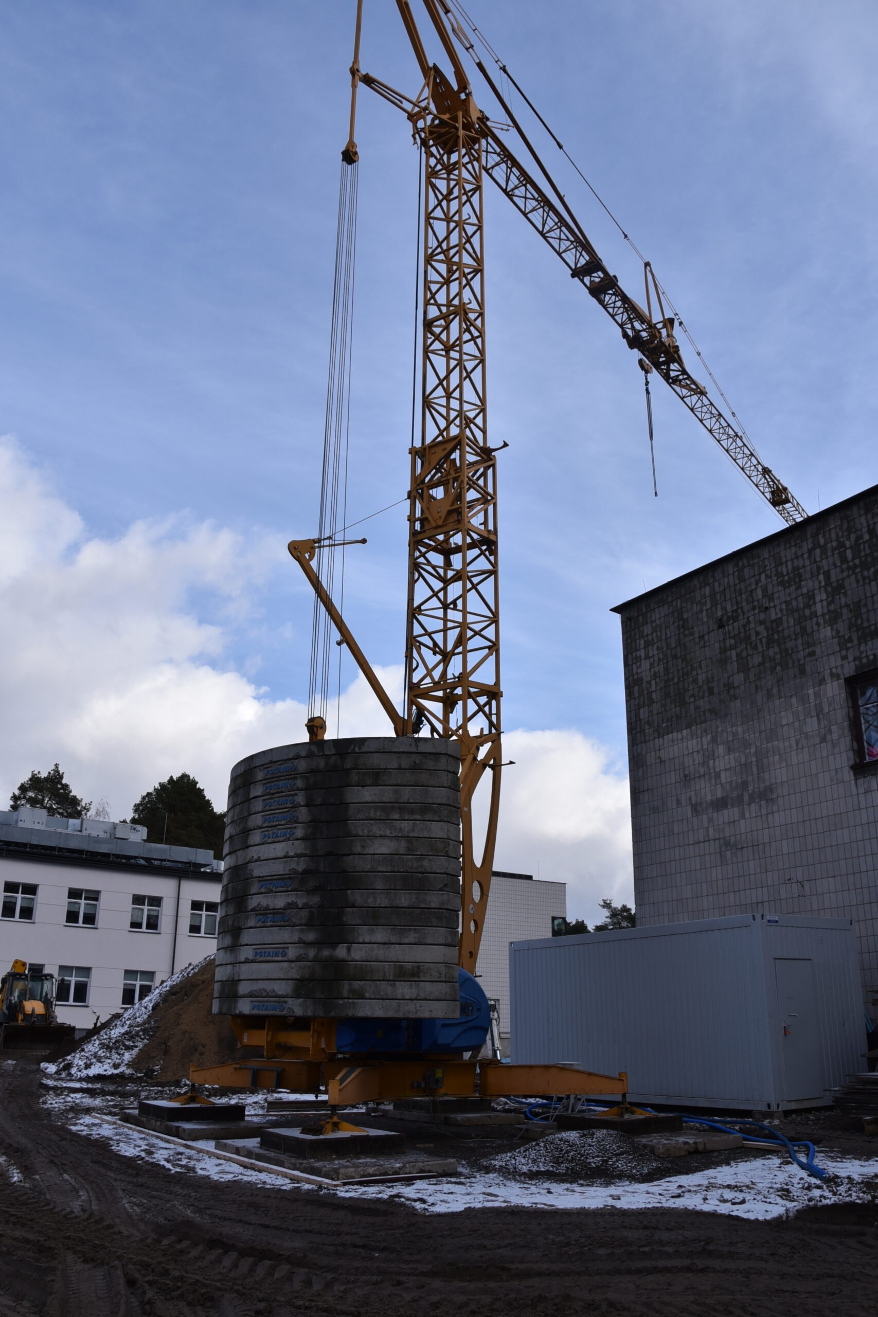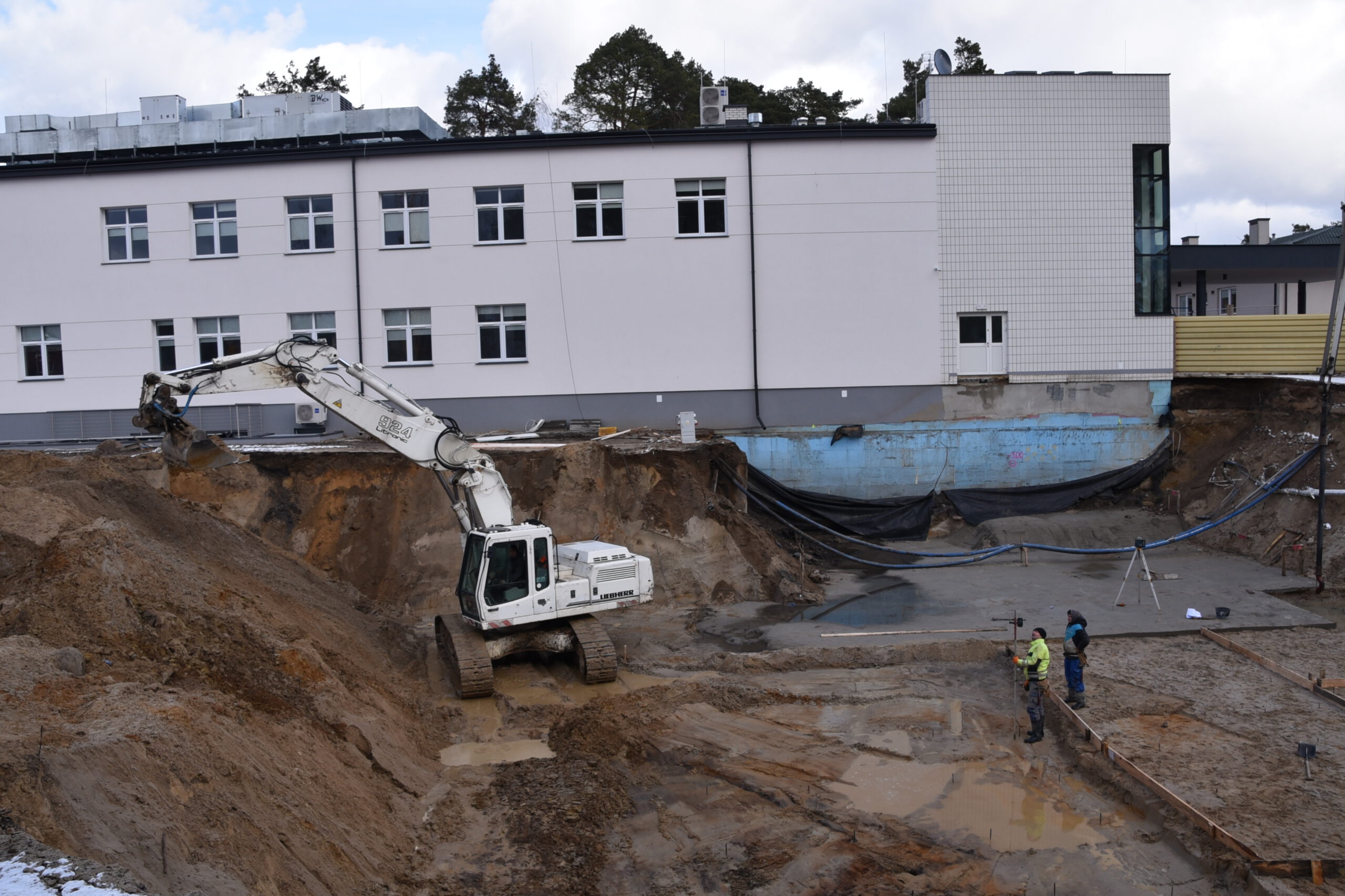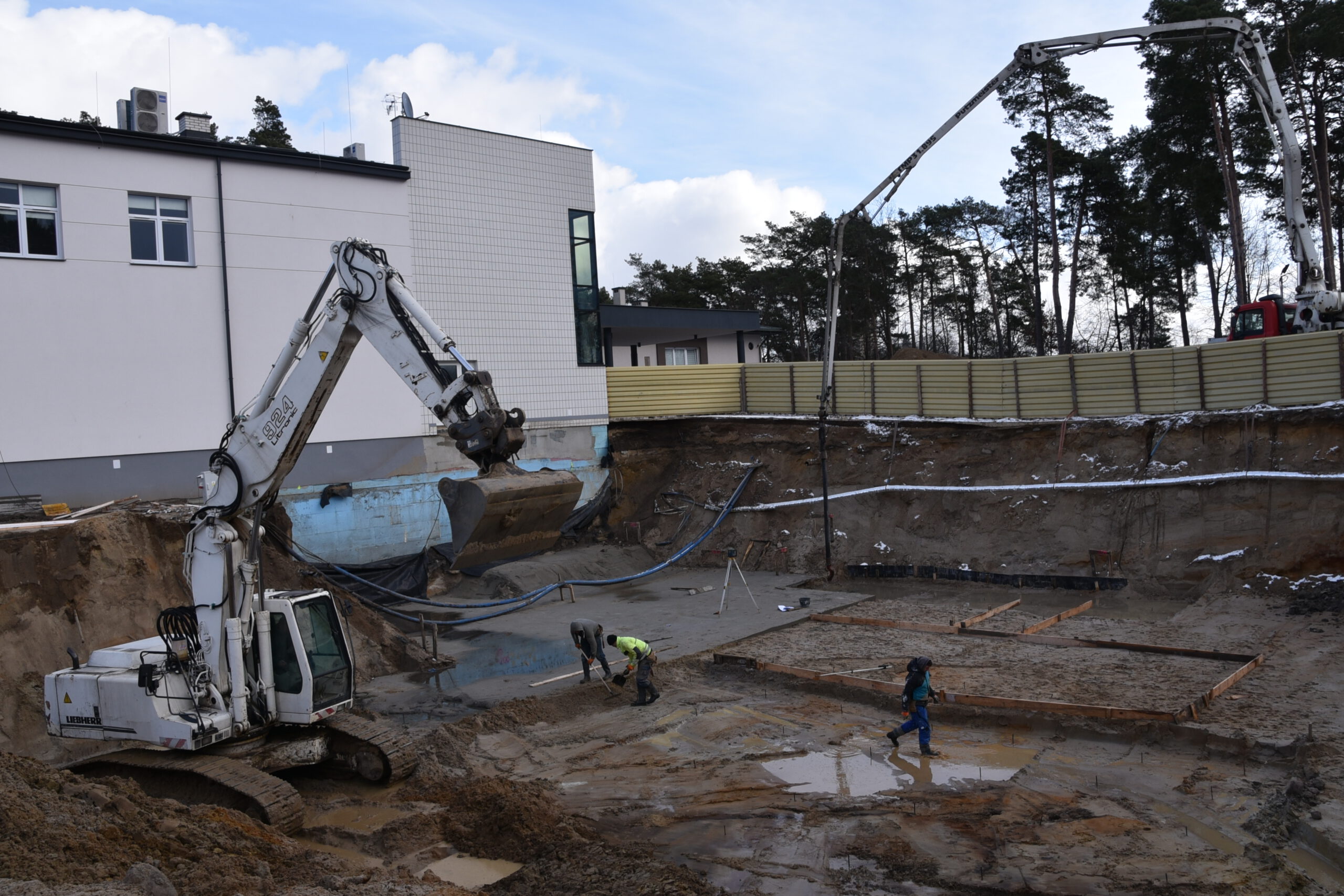 Pracownicy firmy radomskiej Arbud Investments nadal wykonują roboty ziemne oraz prace związane z zalewaniem płyt fundamentowych. Przy budynku starej chirurgii stanął żuraw wieżowy, który będzie ułatwiał transport materiałów budowlanych oraz wylewanie kolejnych elementów konstrukcyjnych. Cały budynek będzie miał dwa piętra.