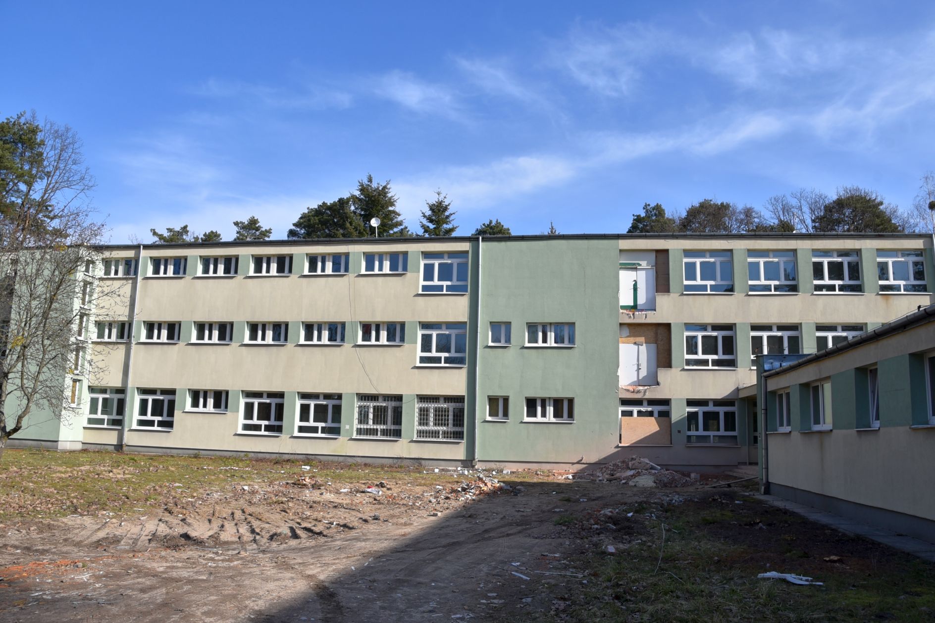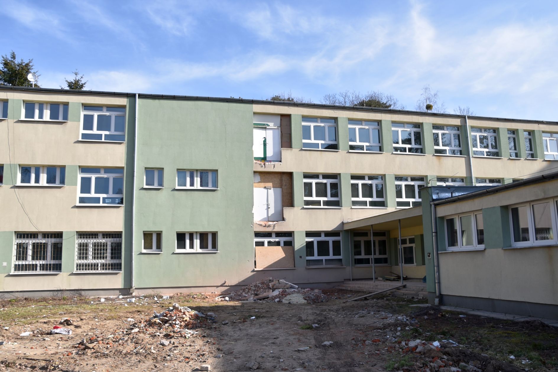 Jak już informowaliśmy, zakres prac obejmuje przebudowę dachu wraz z termomodernizacją całego budynku głównego, budowę szybu windy, rozbiórkę i budowę nowych ścianek działowych, a także dostosowanie łazienek na I i na II piętrze budynku dla potrzeb osób niepełnosprawnych. Będzie też wymieniona instalacja centralnego ogrzewania oraz zmodernizowana kotłownia. W każdej sali będzie umywalka, wszędzie zostaną wymienione podłogi, a wszystkie pomieszczenia na nowo pomalowane. Ma być też klimatyzacja i nagłośnienie sali gimnastycznej. Będzie też monitoring zewnętrzny i wewnętrzny. Trzeba też zaznaczyć, że cały budynek „zielonego” zostanie przekształcony na potrzeby kształcenia specjalnego.