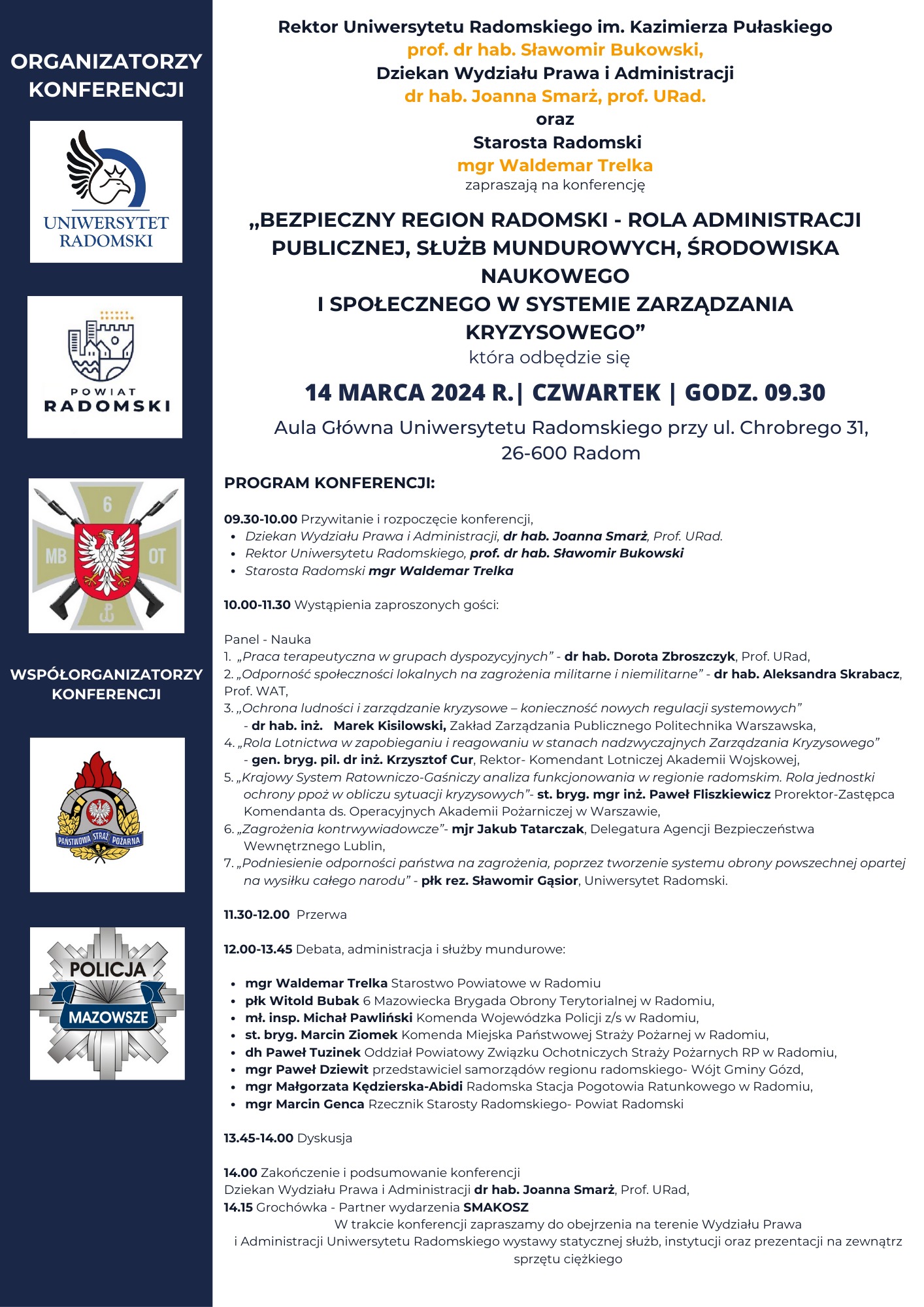 Zapraszamy do udziału w Konferencji „Region Radomski- rola administracji publicznej, służb mundurowych środowiska naukowego i społecznego w systemie zarządzania kryzysowego” w dniu 14 marca 2024 r.