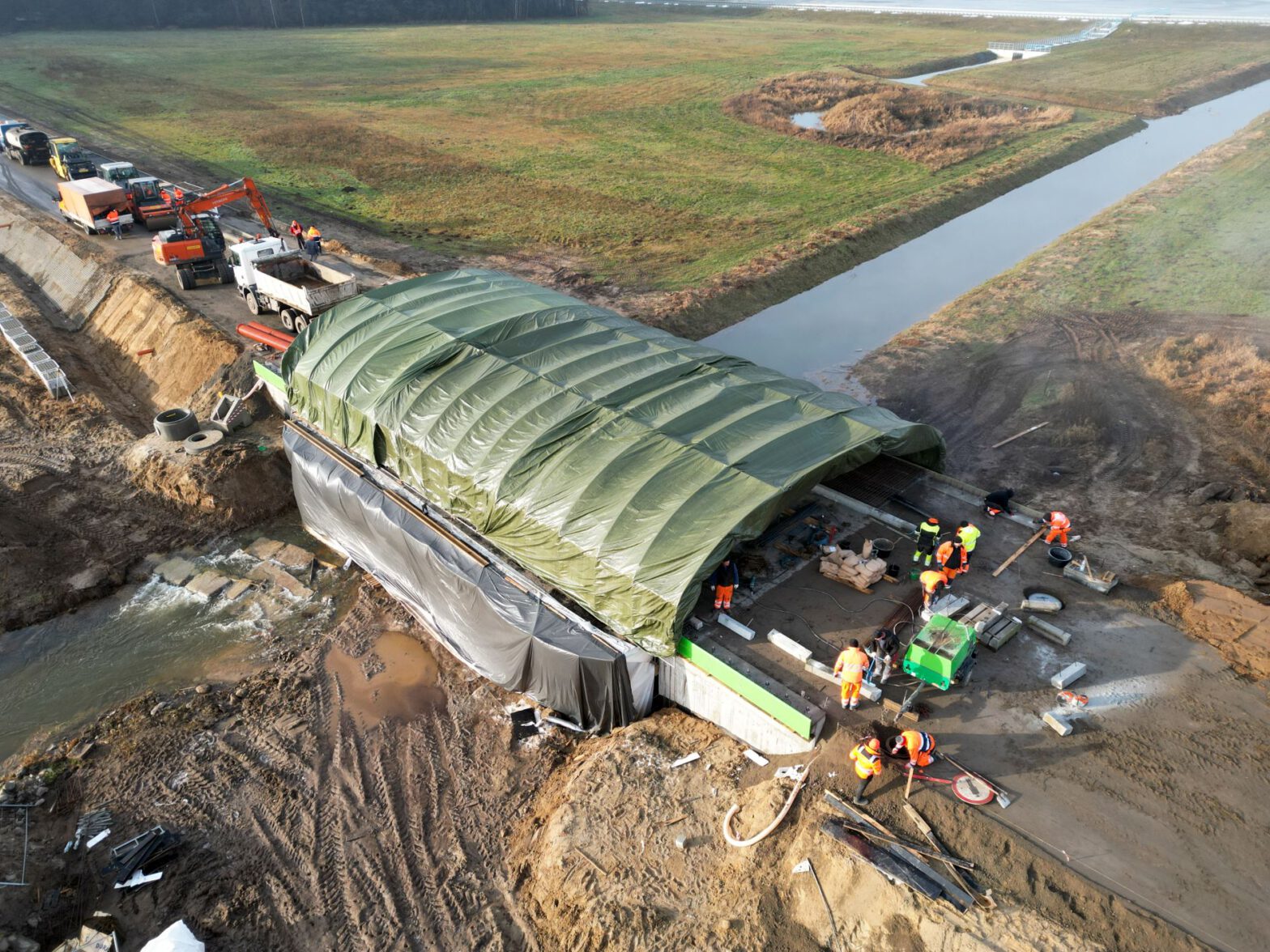 Ogrzewany namiot powstał nad budową mostu w Słowikowie. Pogoda nie przeszkodzi w rozbudowie drogi powiatowej